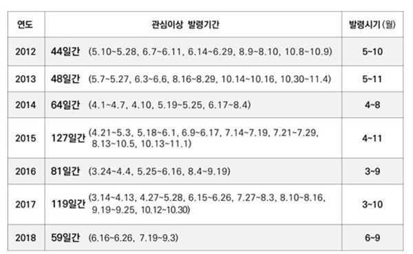 ▲ 충남연구원이 제시한 녹조 발령 상황 ⓒ 충남연구원