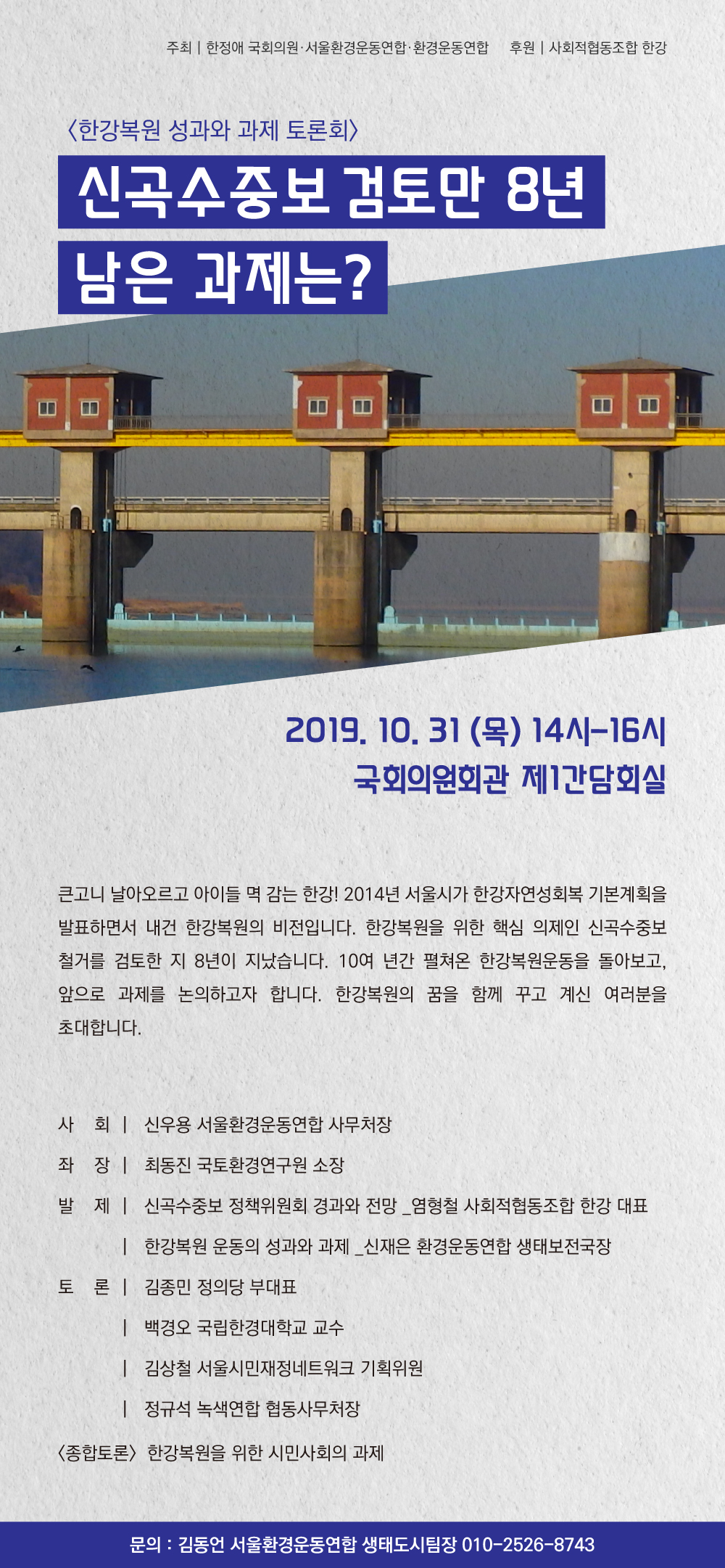 큰고니 날아오르고 아이들 멱 감는 한강! 2014년 서울시가 한강자연성회복 기본계획을 발표하면서 내건 한강복원의 비전입니다. 한강복원을 위한 핵심 의제인 식곡수중보 철거를 검토한지 8년이 지났습니다. 10여 년간 펼쳐온 한강복원운동을 돌아보고 앞으로의 과제를 논의하고자 합니다. 한강복원의 꿈을 함께 꾸고 계신 여러분을 초대합니다.
