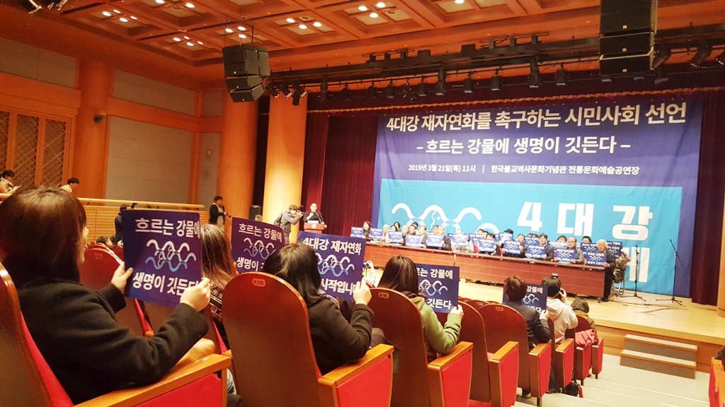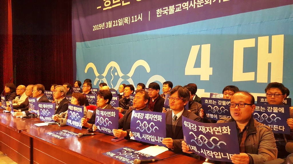 4대강 재자연화 시민위원회와 한국환경회의를 비롯한 종교·여성·노동계 인사를 중심으로 21일 서울 조계사 한국불교역사문화기념관에서 ‘4대강 재자연화 촉구 시민사회 선언’이 열렸다. 이들은 선언문을 통해 “시급히 보를 해체해 강의 자연성을 회복시켜야 함에도 진행 상황이 더디다”고 주장하며 “한 편에서는 자유한국당을 중심으로 4대강 사업 지키기에 혈안이 돼 있고 일부 언론과 4대강 사업에 부역한 전문가들의 억측도 도를 넘고 있다”고 우려했다.
