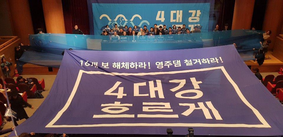 21일 오전 서울 종로구 한국불교역사문화기념관에서 열린 ‘4대강 재자연화 촉구 시민사회 선언’에서 4대강 재자연화 시민위원회와 한국환경회의 등 환경시민단체 회원들이 16개보 해체와 개방을 촉구하고 있다.ⓒ환경운동연합