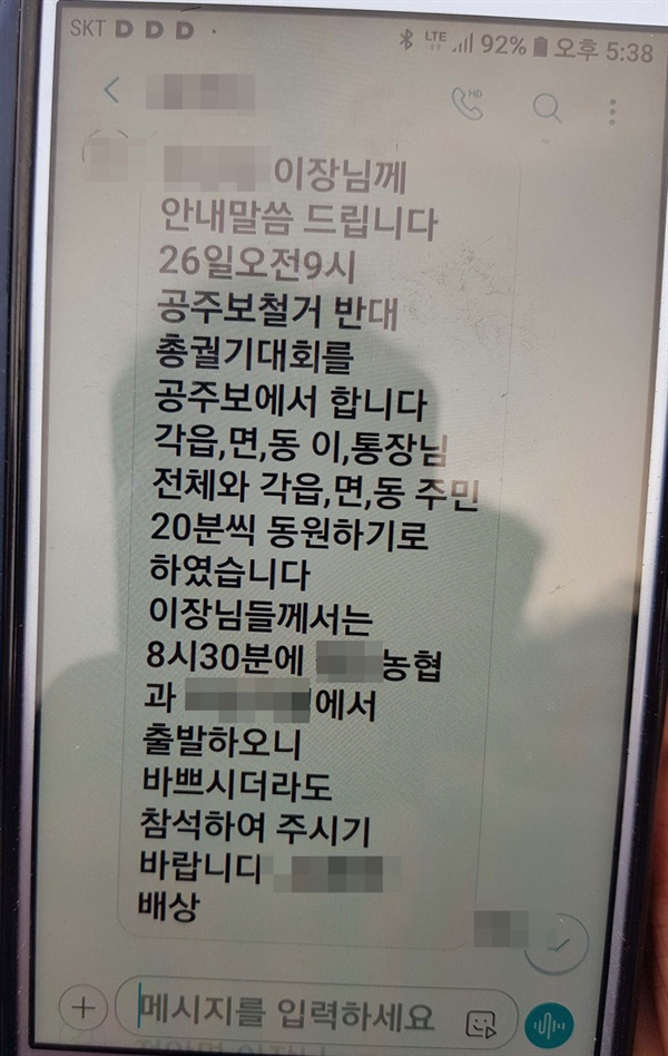 “OO면 이장님께 안내말씀 드립니다. 26일 오전 9시 공주보철거반대 총궐기대회를 공주보에서 합니다. 각 읍면동 이통장님 전체와 각 읍면동 주민 20분씩 동원하기로 하였습니다. 이장님들께서는 8시30분 OO농협과 OOOO에서 출발하오니 바쁘시더라도 참석하여 주시기 바랍니다. OOO 배상”