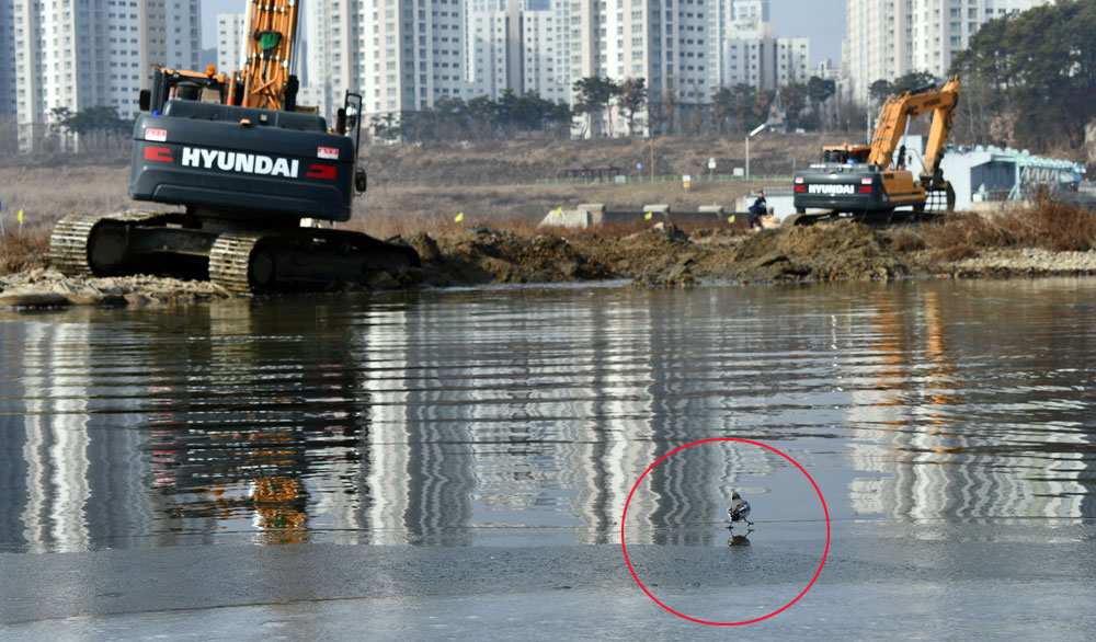 공사로 인해 터전을 빼앗긴 할미새가 중장비 인근까지 날아들어 지켜보고 있다.ⓒ 김종술