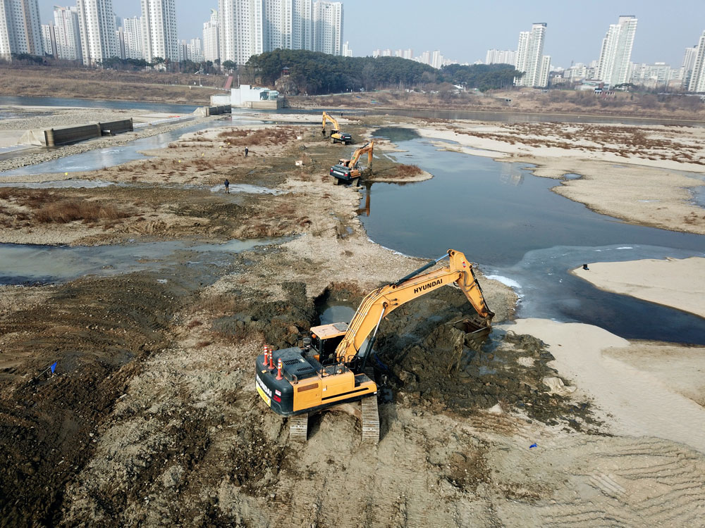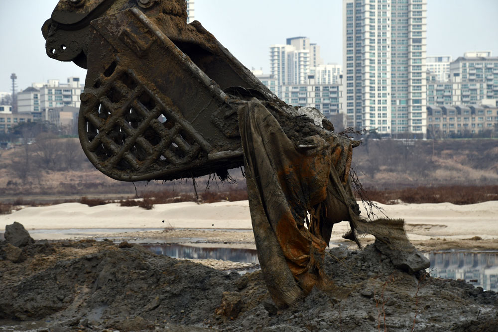 공사 시작 삼 일, 본격적인 제거에 나선 지 이틀째. 거대한 굴착기가 고운 모래와 자갈이 깔린 강바닥을 파헤치자 흙탕물과 함께 강바닥에 깔았던 천막부터 층층이 쌓았던 마대자루가 주렁주렁 올라왔다. 강물과 맞닿는 지점에서는 순식간에 흙탕물로 변하면서 작업자의 시야가 가려 작업은 더디게 진행됐다.