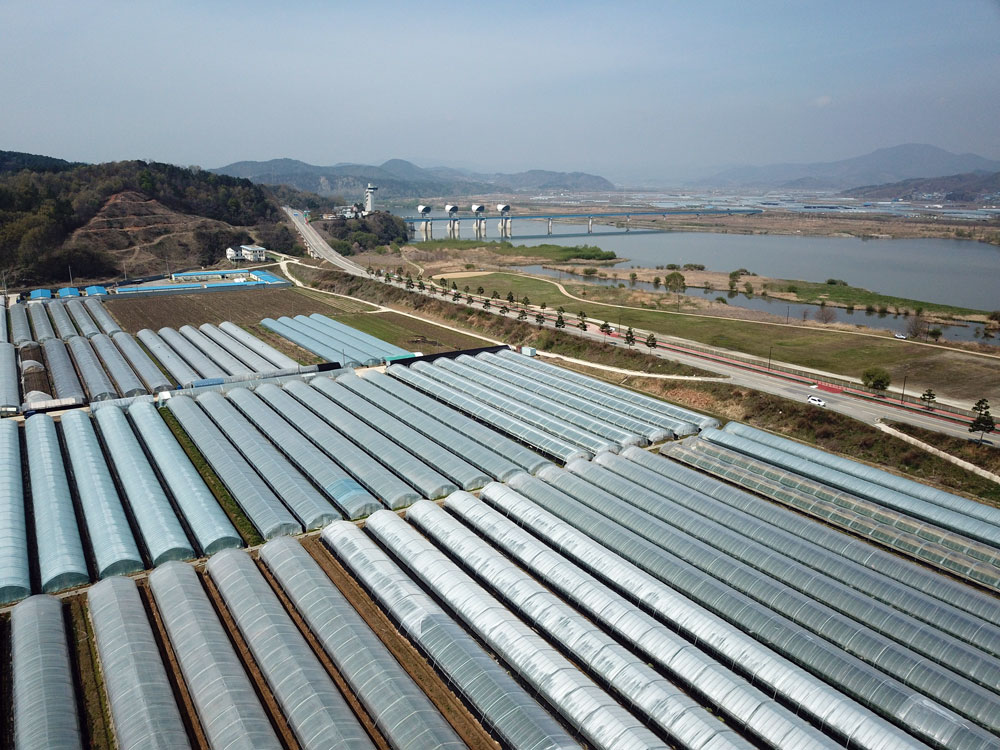 백제보와 도로 하나를 두고 비닐하우스들이 몰려있다. 비닐하우스 950동 정도가 몰린 이곳은 지하수를 이용하여 수막재배와 일반 농법으로 농산물을 재배하고 있다.ⓒ 김종술