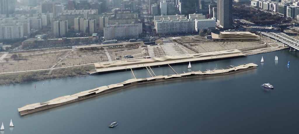서울시에서 내어놓은 통합선착장‘여의나루’조감도. 서울 마포대교와 원효대교 사이 여의도 한강공원 일대 수면 위에 연면적 2100㎡ 규모로 계획해 유람선, 수상택시, 개인 요트 등의 입·출항 하려는 계획을 밝혔다. ⓒ서울시