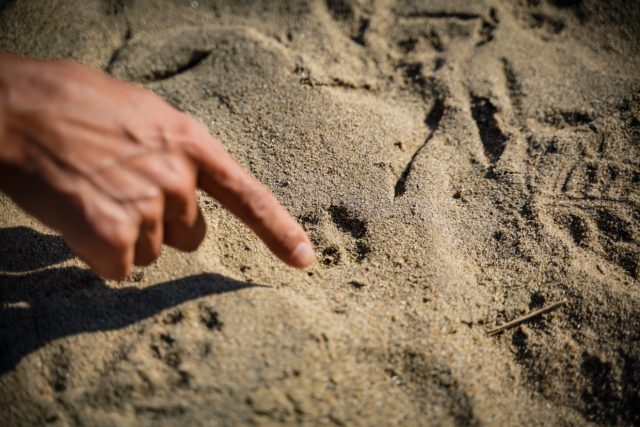 모래톱에 흔적을 확인하고 있는 모습 .ⓒ 이정훈