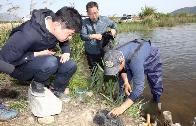 강바닥에서 퍼올린 저질토는 악취 진동하는 썩은 펄이었고, 그 속에서 붉은색깔따구 유충이 확인됐다. ⓒ 이성수