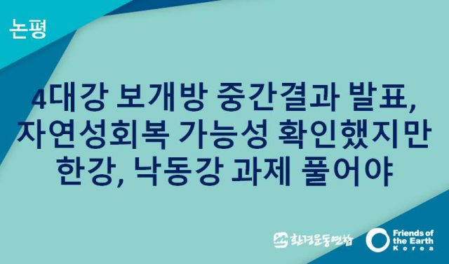 4대강 보 개방 1년 중간결과 발표는 4대강 자연성 회복 가능성과 복원에 대한 정부의 의지를 확인한데 의미가 있다. 보 개방으로 조류농도 감소, 모래톱회복과 동식물 서식환경개선이 이뤄진다는 것을 확인했고, 수문개방의 제약요인을 드러내는 계기가 됐다. 하반기부터는 수문개방 확대를 신속하게 진행하는데 초점을 맞춰야할 것이다. 앞으로 지하수, 취·양수장문제를 해결할 예산을 마련하고, 식수원인 한강과 낙동강의 수질개선을 위한 조속한 수문개방 확대가 이뤄지길 바란다.