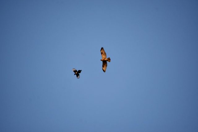 화원동산 하식애 창공 위에서 만난 말똥가리의 비행 모습이다. 까치를 쫓으며 놀고 있다. 까치와 함께 곡예비행을 선보였다. 말똥가리는 멸종위기 야생동물2급종이다. ⓒ 대구환경운동연합 정수근–