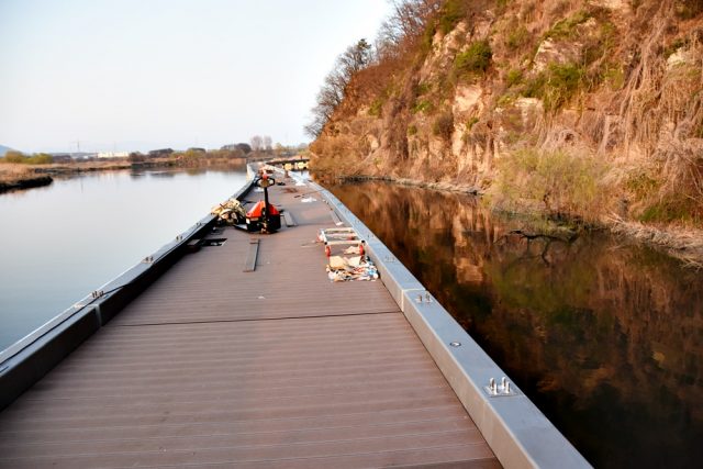 그런데 이곳에 느닷없이 지난해 8월부터 대구 달성군이 관광사업의 일환으로 탐방로 공사를 시작했습니다. 길이 1km에 이르는 이 탐방로는 화원동산 하식애를 둘러싸며 건설되고 있습니다. 물론 달성군이 해명하는 것처럼 하식애로부터 10여m 띄워서 강 안에다 강철파일을 박아서 탐방로를 건설하기 때문에 하식애 자체의 손상은 없을 수 있습니다.