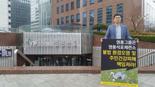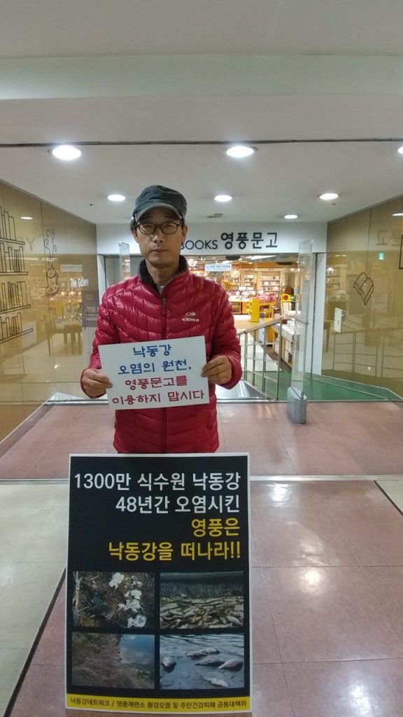 서울 종로구 영풍문고 본점 앞에서 1인시위를 전개한 환경운동연합 최준호 사무총장은 “영풍문고의 모기업인 영풍그룹은 문화 허브기업의 이미지로 포장한 채 반세기동안 1300만 영남인들의 식수원을 더럽혀왔다”면서 “이렇게 단 하나의 기업이 어떻게 48년간 낙동강 최상류에서 중금속 오염물질을 무단방류하면서 지금까지 공장을 가동해왔는지 의심스럽다”고 개탄했다.