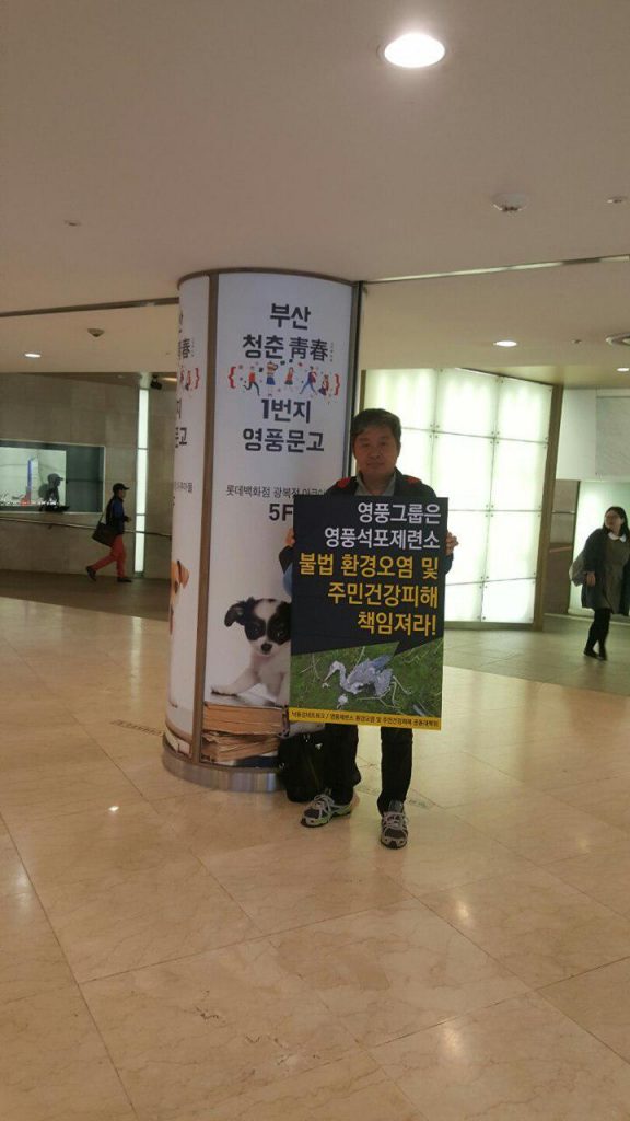 낙동강오염방지협의회 박용수회장이 부산 영풍문고 앞에서 1인시위를 진행하고 있다.ⓒ영풍제련소 환경오염 및 주민건강 피해 공동대책위원회