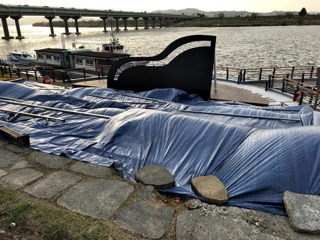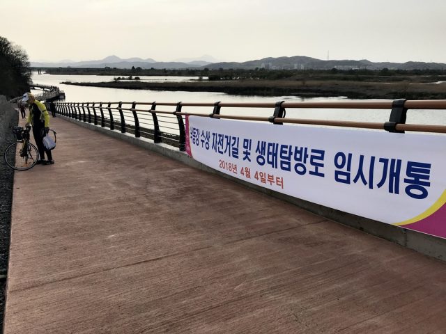 그런데 이상하다. 곳곳에 공사용 자재와 쓰레기가 널렸고, 강물 속에는 죽은 물고기와 쓰레기, 심지어 쥐의 사체도 보였다. 아직 공사가 덜 끝이 난 것이 분명했다. 그런데 곳곳에서 탐방로 임시개통 현수막이 마구 나부낀다. 임시개통이란 또 무언가? 이 탐방로가 임시개통을 해야 할 정도로 그렇게 시급했던 걸까?
