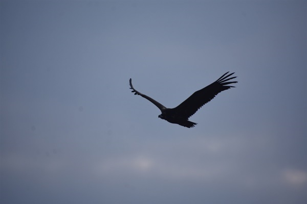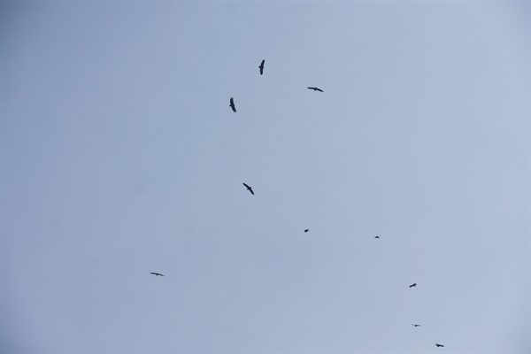 낙동강을 찾은 독수리들이 먹이 나누기 행사의 의미를 아는지 주변 하늘을 선회 비행하고 있다.ⓒ 대구환경운동연합 정수근