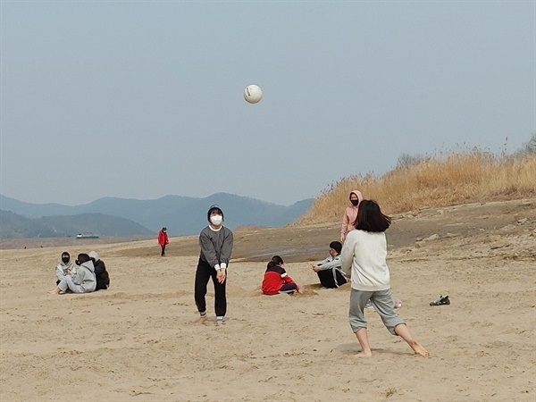 낙동강을 찾은 아이들이 배구를 하면서 모래톱을 즐기고 있다.ⓒ 이상범