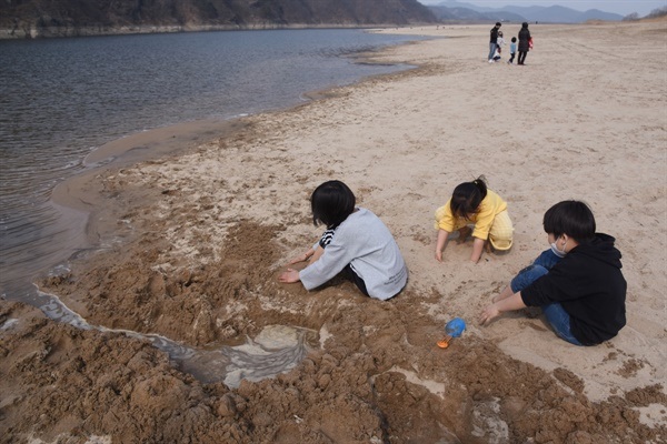아직 겨울임에도 아이들이 신발을 벗고 모래성을 쌓으며 놀고 있다. ⓒ 대구환경운동연합 정수근