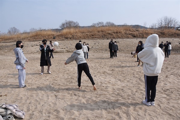 역시 아이들이었다. 낙동강 모래톱을 찾은 대구지역 초등학교, 중학교 아이들은 모래톱에서 다양한 놀이를 즐겼다. 함께 모여 피구를 하는가 하면 삼삼오오 배구를 하고 그것도 지겨워지면 물가로 가서 모래성을 쌓고 두꺼비집을 짓고 필드스코프로 독수리를 관찰하는 등 모래톱에서 할 수 있는 다양한 놀이를 즐겼다.