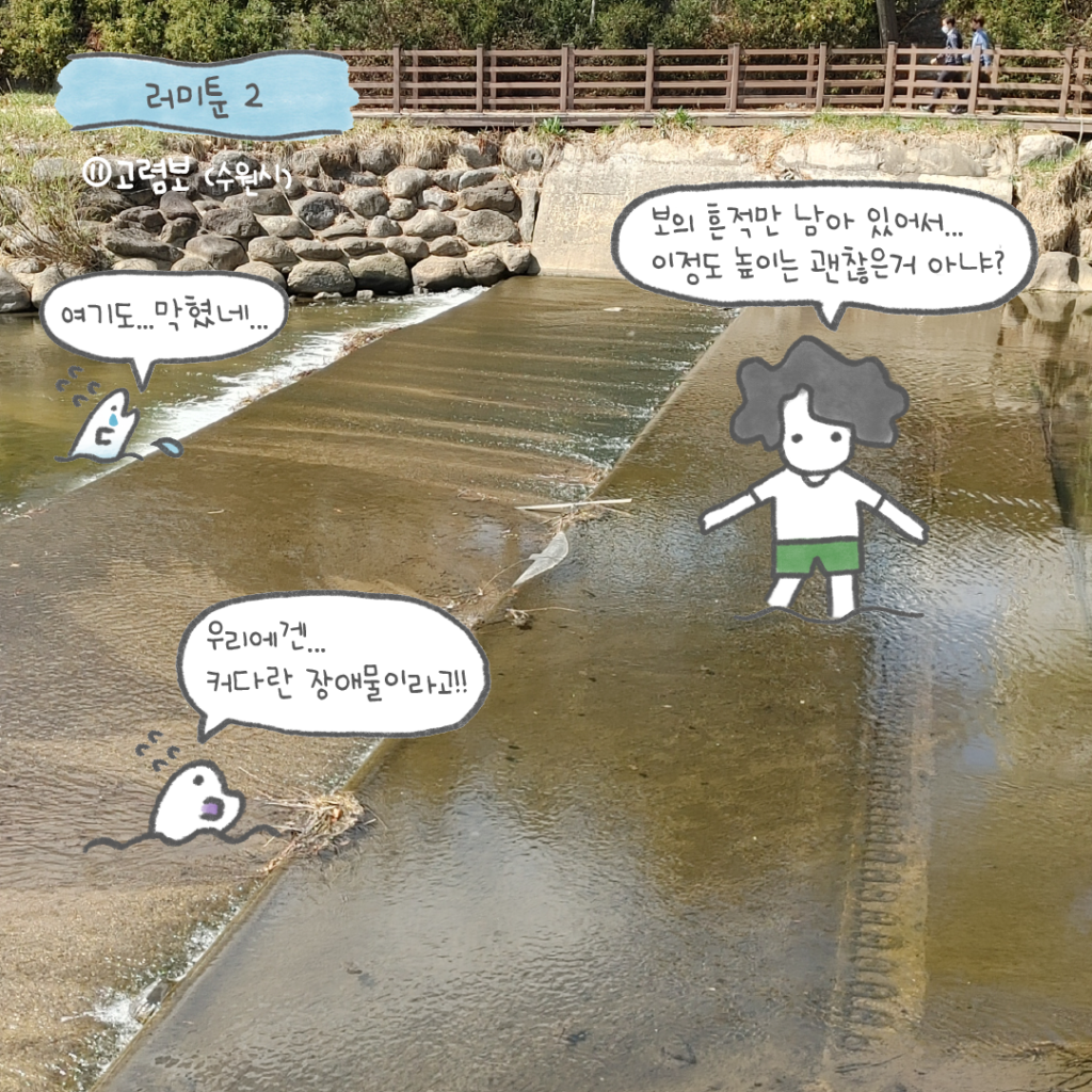 이곳도 과거 농사지을 물을 위해 만들었지만, 이제는 주변에 아파트와 대규모 공업 단지들이 들어서면서 용도를 잃어 단어 그대로 “방치”되었다고 할 수 있어요. 사람 눈에는 별거 아닌 것처럼 보여도, 물속 생물들이 자유롭게 다니기에는 여전히 불편할 구조물이랍니다. 고렴보처럼 용도 없이 방치된 보가 아직 많을 거예요.