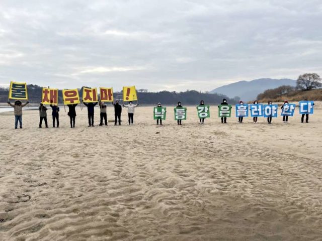 이날 현장에서는 “물 채우지 마! 낙동강은 흘러야 한다”를 한 글자씩 새긴 현수막을 들고, “물 채우지 마라, 낙동강은 흘러야 한다”는 연호하는 현장 퍼포먼스를 벌였습니다. 두 곳 양수장에 비상급수시스템을 조치해 늦어도 4월 말까지는 수문개방을 연장해야 한다고 주장했습니다. 그래야 최소한의 보 개방 모니터링이 된다는 것입니다.