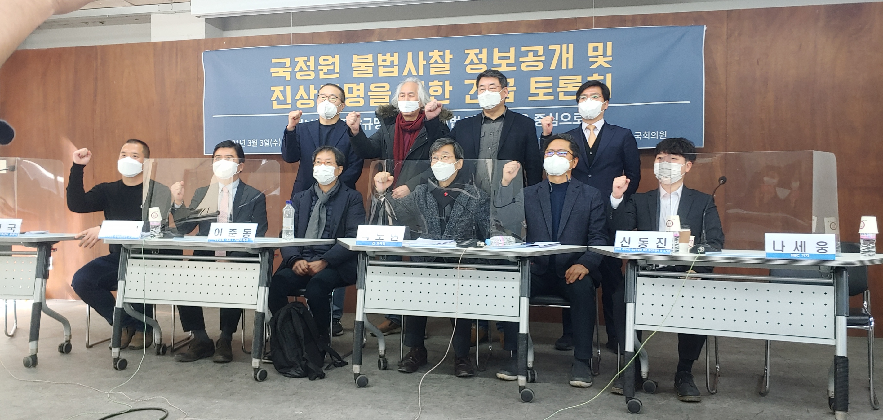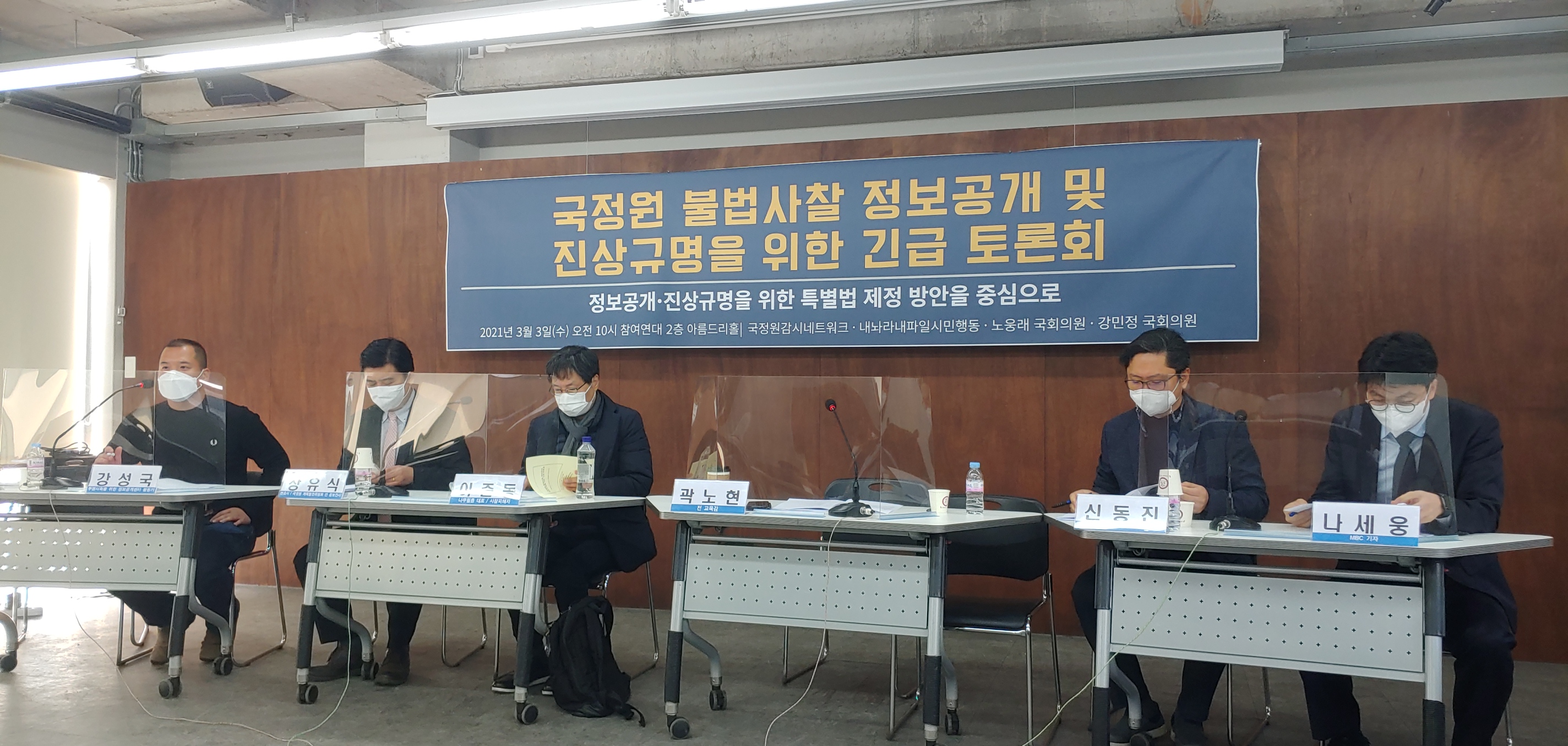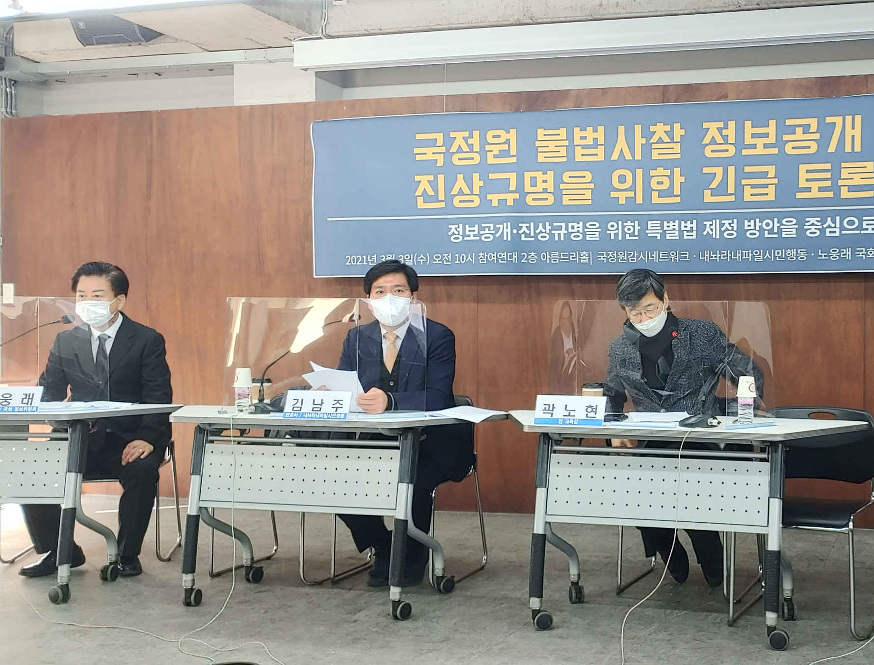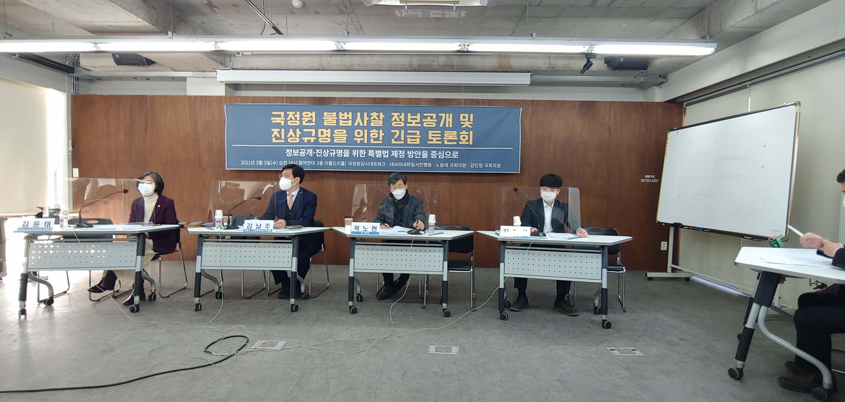 3월 3일 국정원감시네트워크, 내놔라내파일시민행동, 노웅래 국회의원, 김윤덕 국회의원, 강민정 국회의원이 공동으로 주최하는 “국정원 불법사찰 정보공개 및 진상규명을 위한 긴급 토론회”가 열렸다. 특벌법 제정 등 국정원의 불법사찰 정보의 공개 및 폐기, 진상규명을 위한 법적 근거 마련을 위해 열린 이번 토론회는 다양한 방안을 검토하고, 국회와 정부에 진상규명을 촉구하기 위한 논의가 이루어졌다.