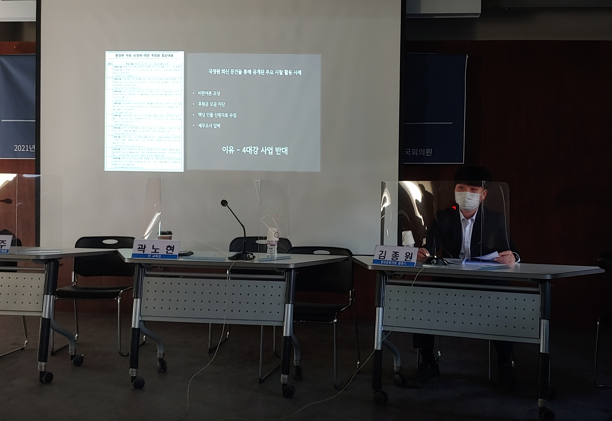 환경운동연합은 이번 토론회에 이명박 정부 당시 4대강 사업에 반대하는 단체와 민간인에 대한 국정원의 불법적인 사찰 및 방해공장 피해 사례에 대해 발제하기 위해 참여하였다. 발제를 맡은 김종원 환경운동연합 활동가는 2018년 국정원이 환경부의 요청에 의해 회신한 보고서의 내용을 바탕으로 명시된 기간 당시 환경운동연합을 비롯한 시민사회단체와 활동가, 학자 및 이를 후원하는 단체에 대해 국정원이 자행한 각종 사찰ㆍ방해 활동과 보수단체에 대한 지원 활동을 발표하였다. 또한 보고서에 명시된 내용 이외에도 국정원이 활동한 것으로 추정되는 사항과, 구체적으로 어떤 정보를 얼마나, 어떻게 수집했는지에 대한 의혹이 아직까지 밝히지 않고 있음을 지적하며 국정원은 1쪽짜리 보고서가 아닌 수집한 모든 정보를 가감 없이 밝히고, 책임자에 대한 처벌을 이루어내야 한다고 강조하였다.
