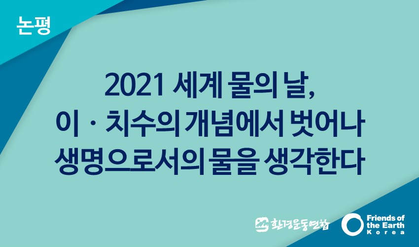 우리에게 ‘물’이라 하면 마시고, 이용하는 자원으로써의 물을 흔히 떠올리곤 하지만, 물은 그 자체로 강ㆍ하천을 이루어 수많은 생명의 보금자리가 되는 터전, 생명의 장소이다. 우리는 이러한 의미에서 물이 가지는 의미를 생각해야 한다. 오늘 3월 22일 세계 물의 날을 맞아 물이 가진 의미를 다시 한번 새기고자 한다.