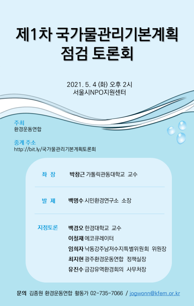 5월 4일(화) 오후 2시 “제1차 국가물관리기본계획 점검 토론회” 를 개최합니다. 많은 관심과 참여 바랍니다.