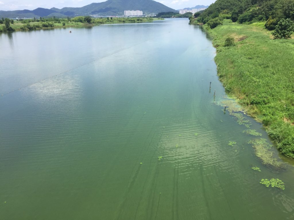 녹조로 뒤덮여 초록 빛을 띠는 낙동강